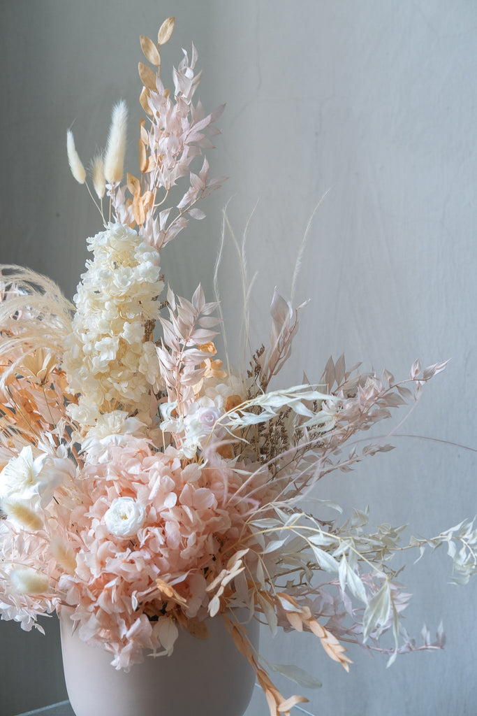 A textural show-stopper for any lover of pink. This arrangement features large-petalled hydrangea and Japanese snowflake hydrangea, with sola flowers, dried fillers and preserved leaves rounding out the details.