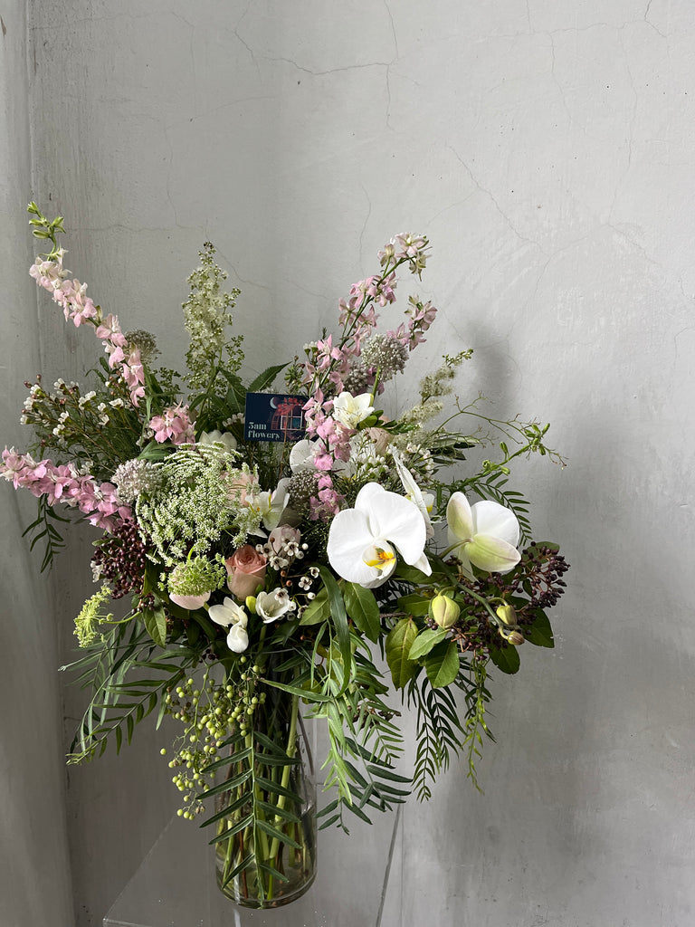 While requests such as “no roses, wildflower style” can produce a smaller & daintier arrangement, be rest assured arrangements will always contain the same value of flowers. As each bouquet is crafted to order according to choices, you will receive an arrangement different from the pictures.